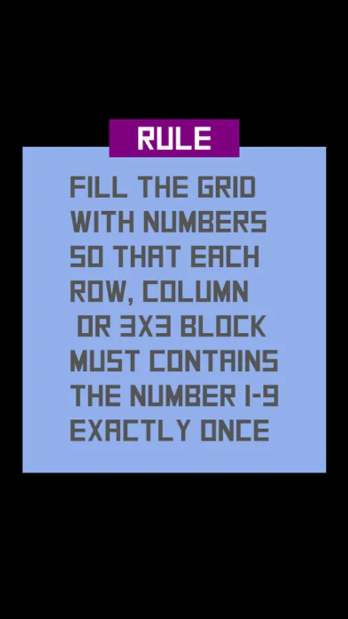 Rule: fill the grid with numbers, so that each row, column or 3x3 block must contains the number 1-9 exactly once.