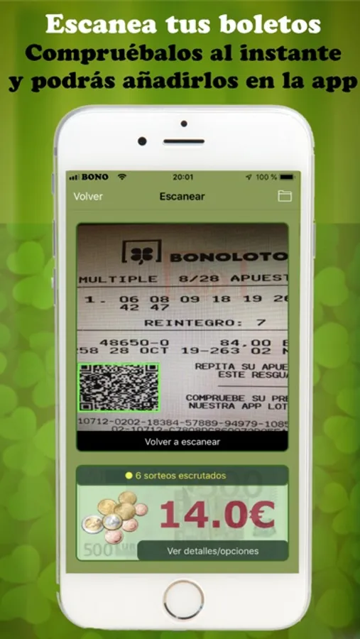 - Escanea tus boletos en papel y enseguida sabrás si tienes premio. Puedes escanearlo para incluirlo en la app.