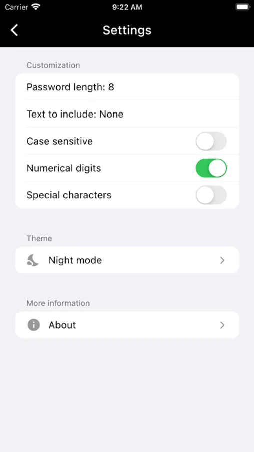 Configure password settings such as: length, characters, uppercase, special, your own text embedded...
