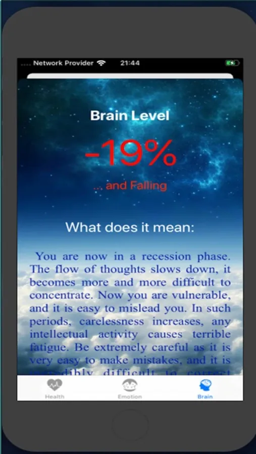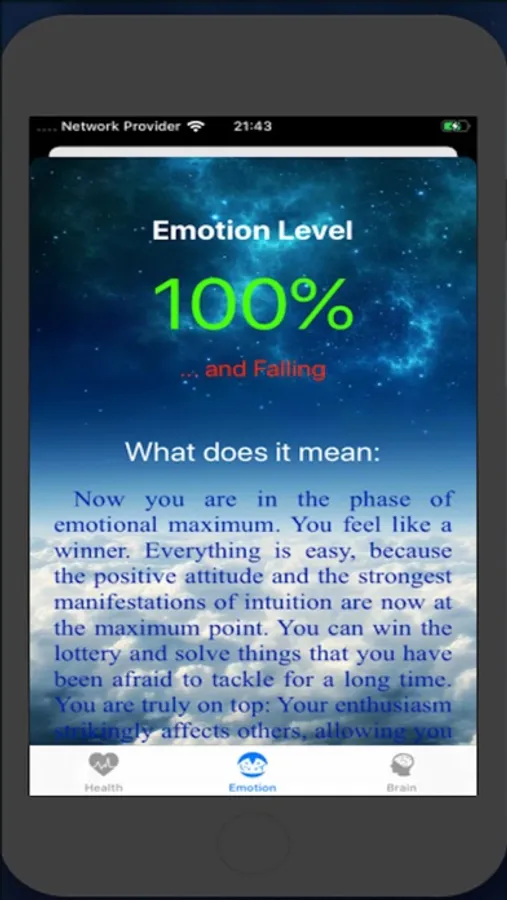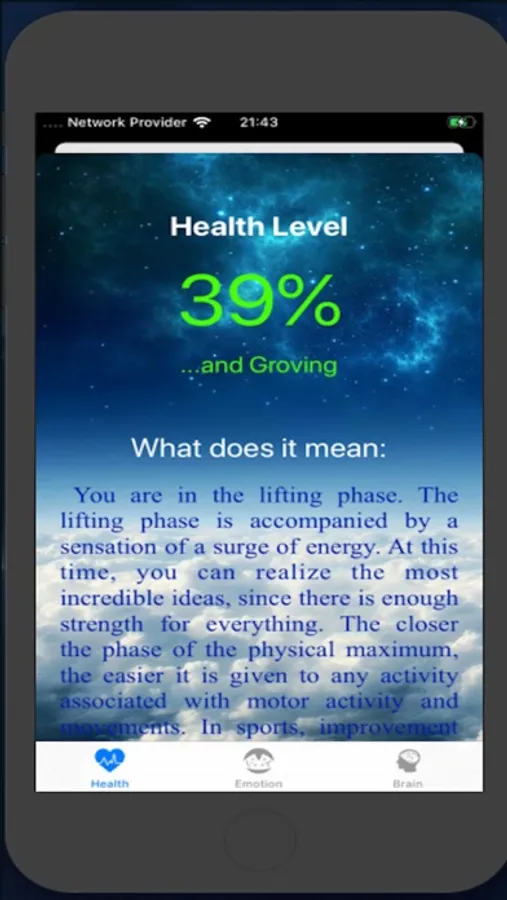 The application shows your biorhythms for today and their dynamic for near future and gives tips to make your day more successful.