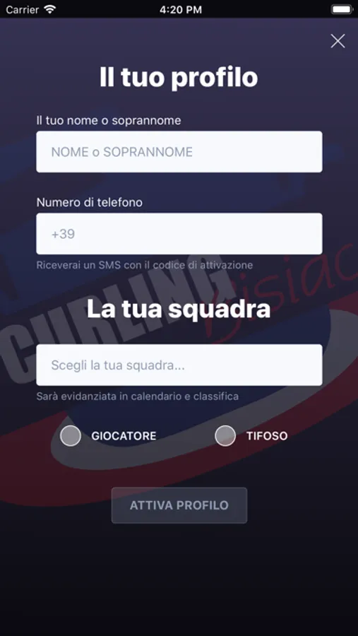 Per attivare il tuo profilo, inserisci il tuo numero di telefono per ricevere un SMS con il codice di attivazione di 6 cifre.