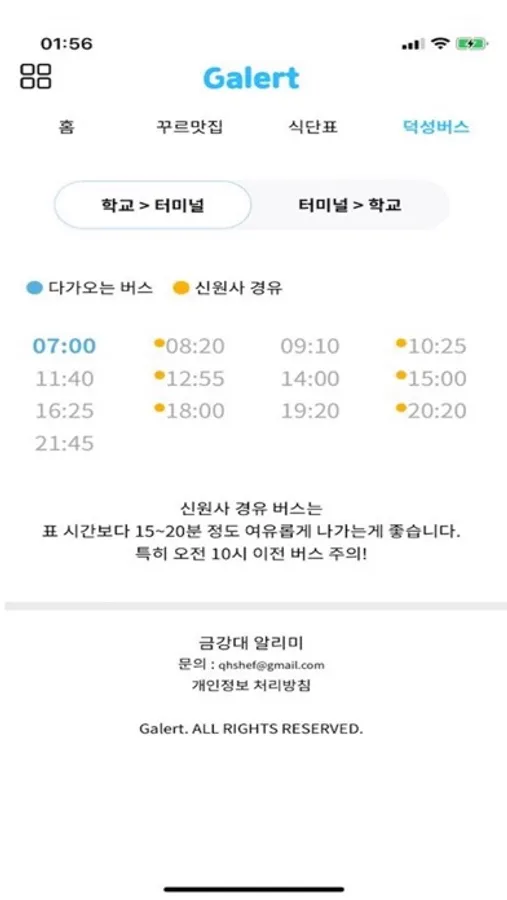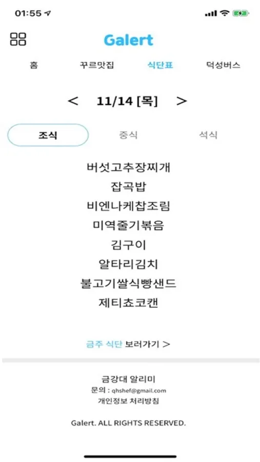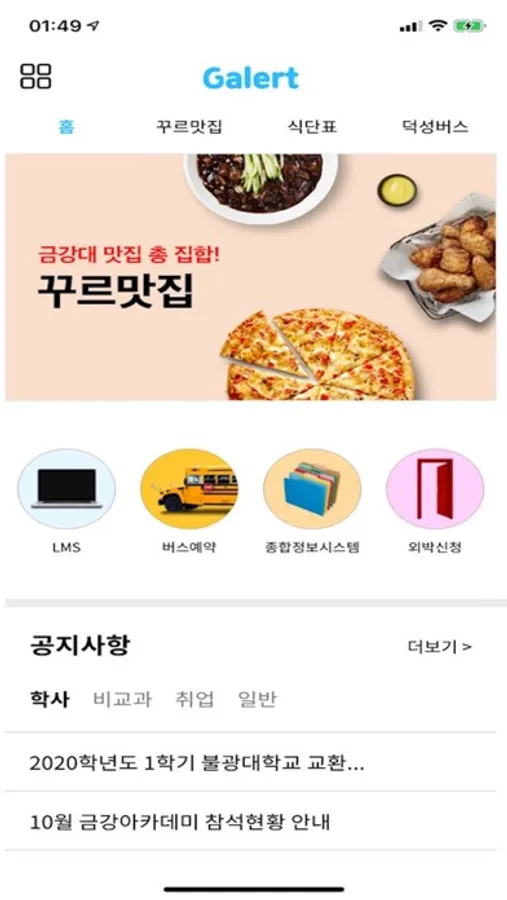 금강대 캠퍼스 라이프를 위한 생활정보 (공지, 식단, 버스 등등...)을 제공하는 금강대 알리미 어플 Galert 입니다.