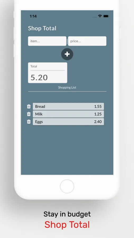 A simple app to help to keep to budget while shopping. Add items and an estimated price and the app will calculate the total.