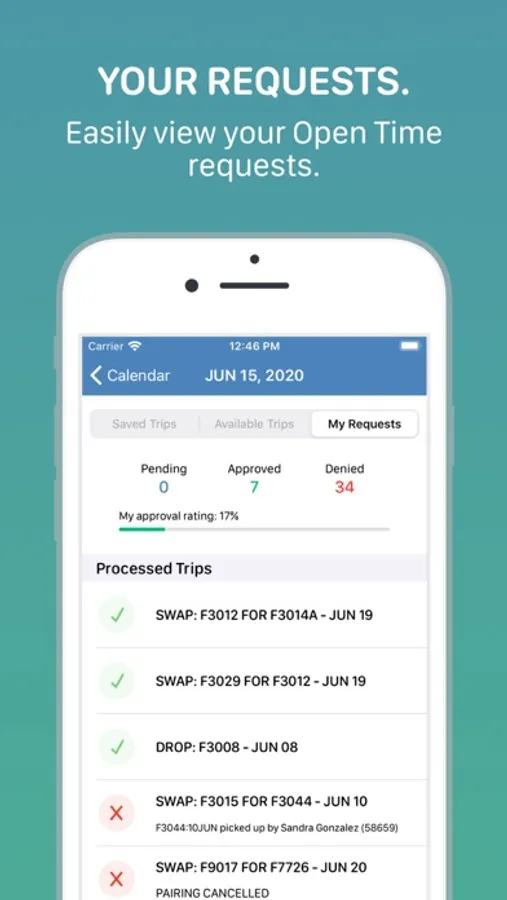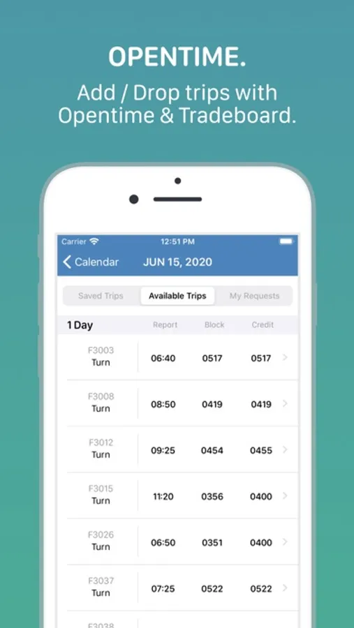 Crewline makes it very easy to see open time and trade board. It sorts them by the total available trips per day and you see them right on your calendar. Tap on them and you’ll be presented with an organized list of trips that are already sorted for you.