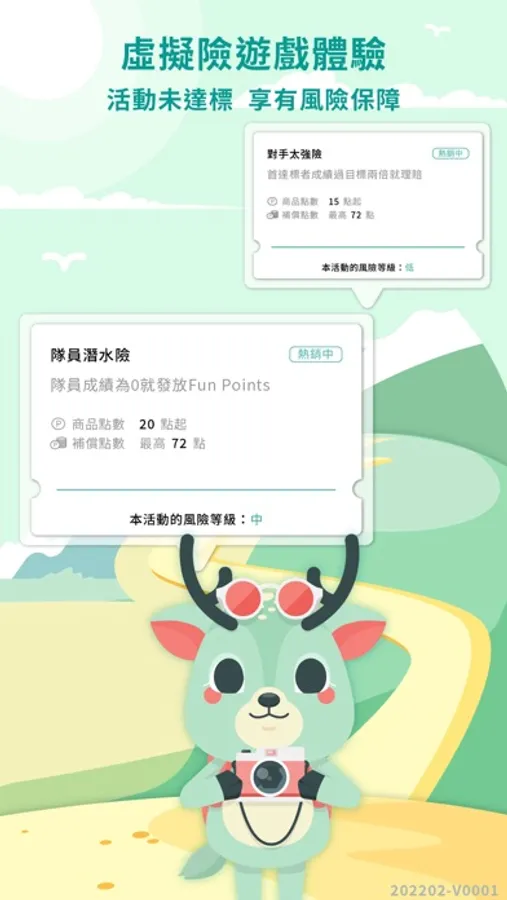● 虛擬險遊戲體驗機制:擔心因為不可預知的狀況導致無法達成活動目標?申請體驗虛擬險遊戲,協助你防範於未然。