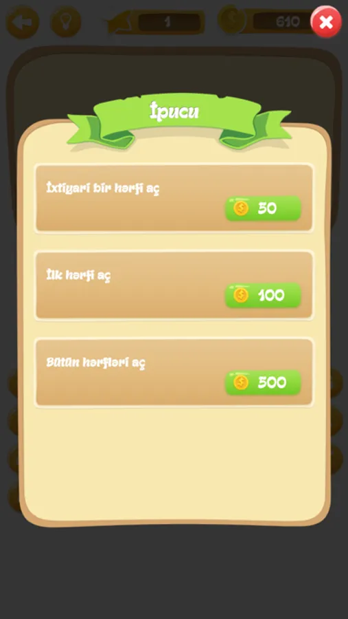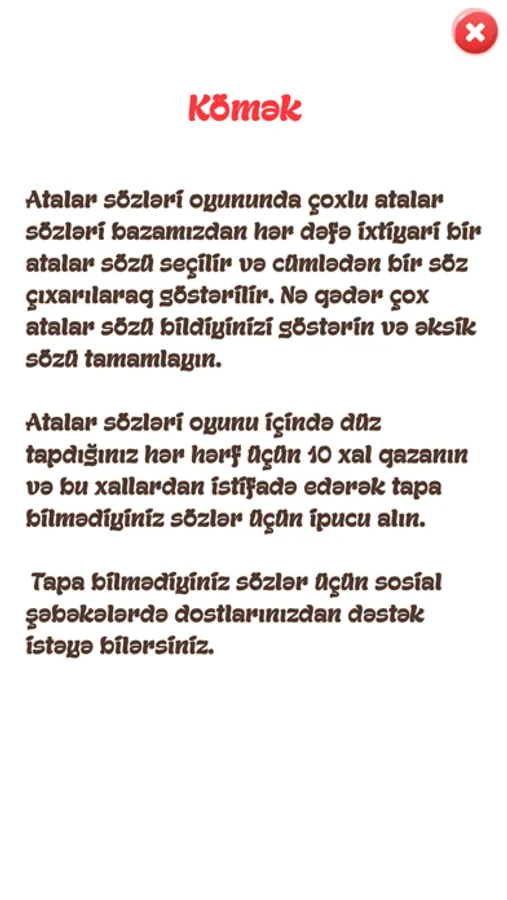 Atalar sözləri oyunu içində düz tapdığınız hər hərf üçün 10 xal qazanın və bu xallardan istifadə edərək tapa bilmədiyiniz sözlər üçün ipucu alın.