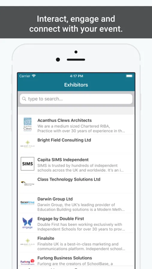 • Networking: Delegate lists, instant messaging, activity feed and exhibitor details
