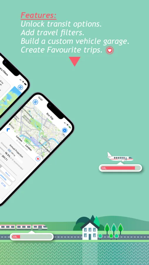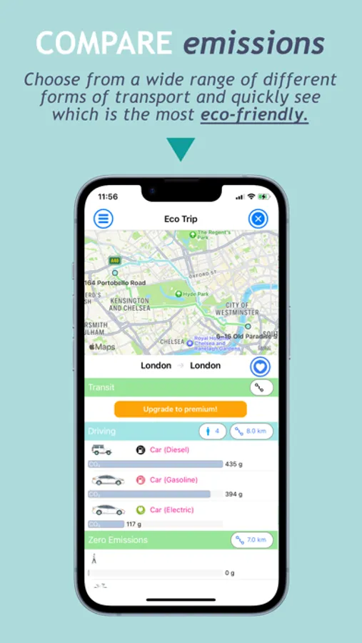• Eco Trip will display the route and comparative emissions for various transport options, eg: flying vs driving