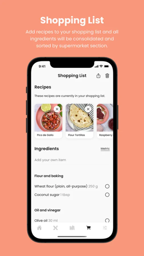Add recipes to your Shopping List, and all ingredients will be consolidated and sorted by supermarket section for your convenience.