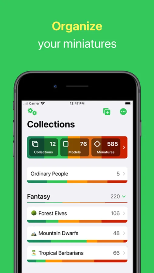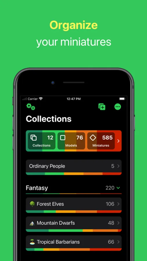 Organize your miniatures into collections (e.g. by factions or game systems). Track your assembly and painting progress (Unassembled ▸ Assembled ▸ Primed ▸ Painted ▸ Based). As result you get an overview of your miniature collection, to decide on your next painting project and know how many miniatures you have ready for your games. You can also add miniatures to your wishlist.