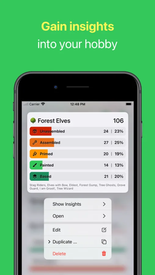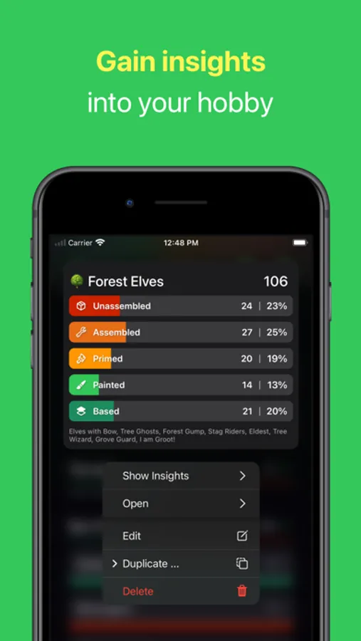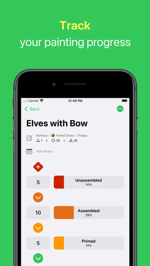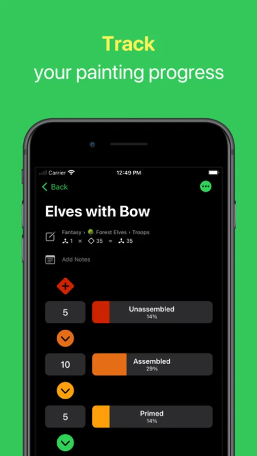 - Follow your progress from Unassembled ▸ Assembled ▸ Primed ▸ Painted ▸ Based.