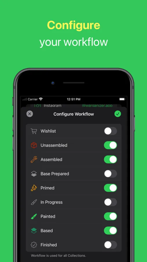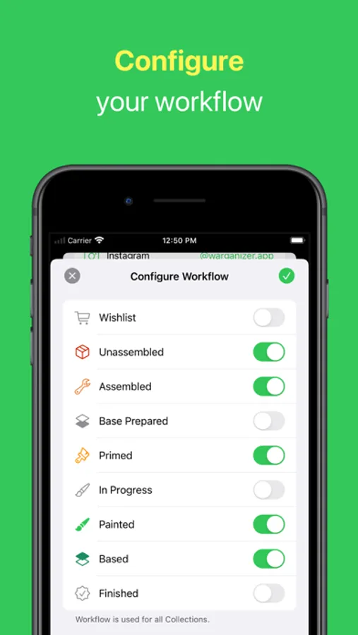 - Configure your workflow: Wishlist, Unassembled, Assembled, Base Prepared, Primed, In Progress, Painted, Based, Finished.