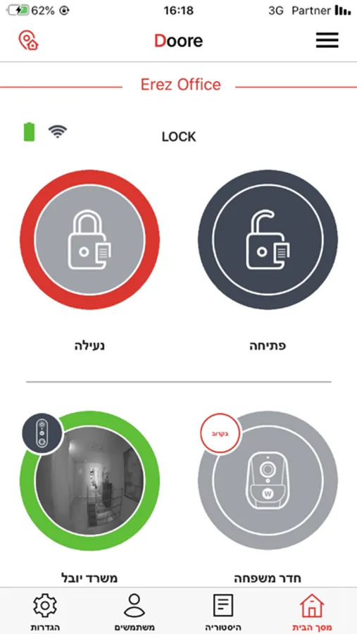 - יחד עם המנעול החכם DOORe תוכל לפתוח את הדלת ממסך הצפייה של הפעמון.