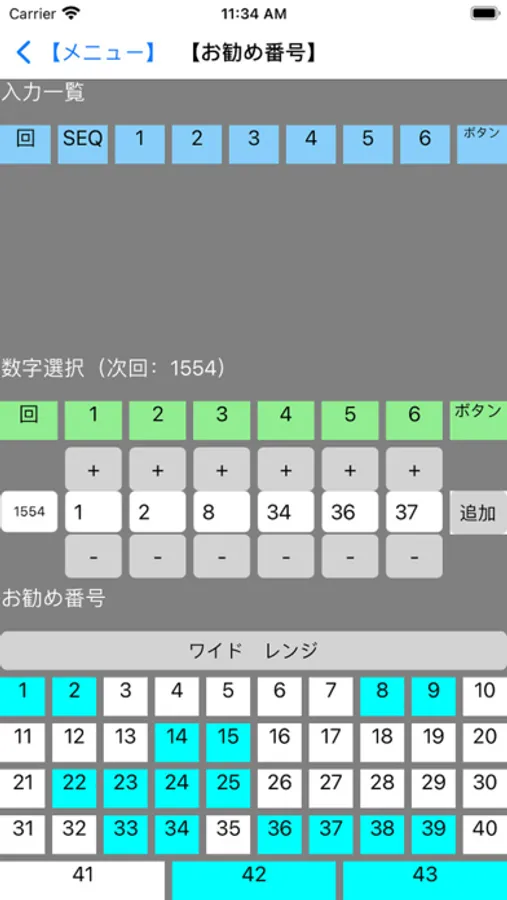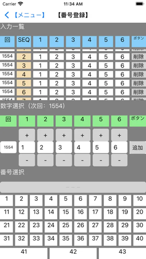 1~43の番号をタップすると中央の数字選択の1~6に追加されます。