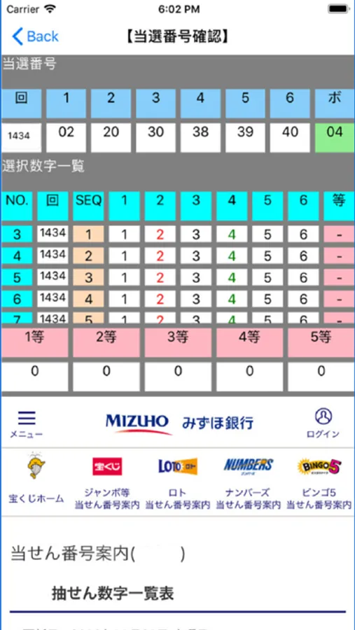 自分が選択した番号を入力して保存しておくと、当選結果を自動的に判定して表示します。