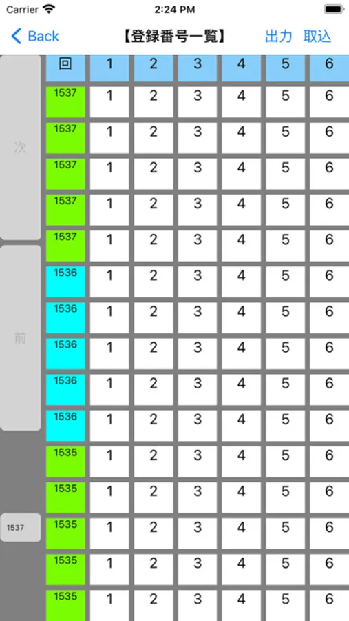 「前」をタップすると、現在の画面に表示されている一番小さい番号の1つ前の番号の当選番号までが表示されます。