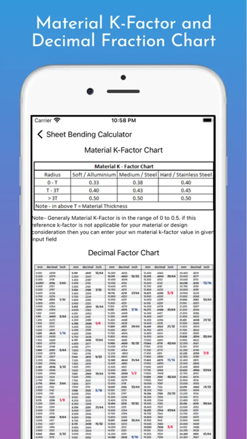 material k-factor chart and decimal fraction chart available for reference.