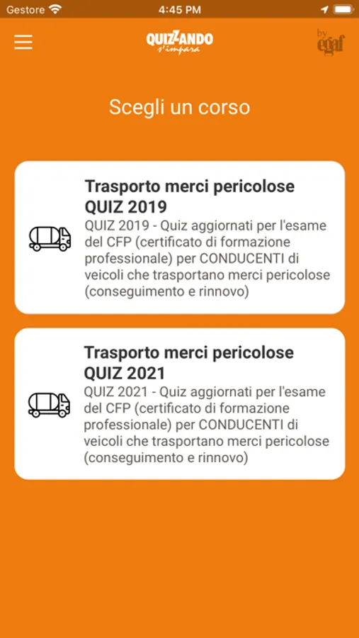 Quiz CFP ADR 2022 è l'app per i quiz del "Patentino ADR" sviluppata e costantemente mantenuta da EGAF (leader nel settore circolazione stradale, motorizzazione e trasporti).