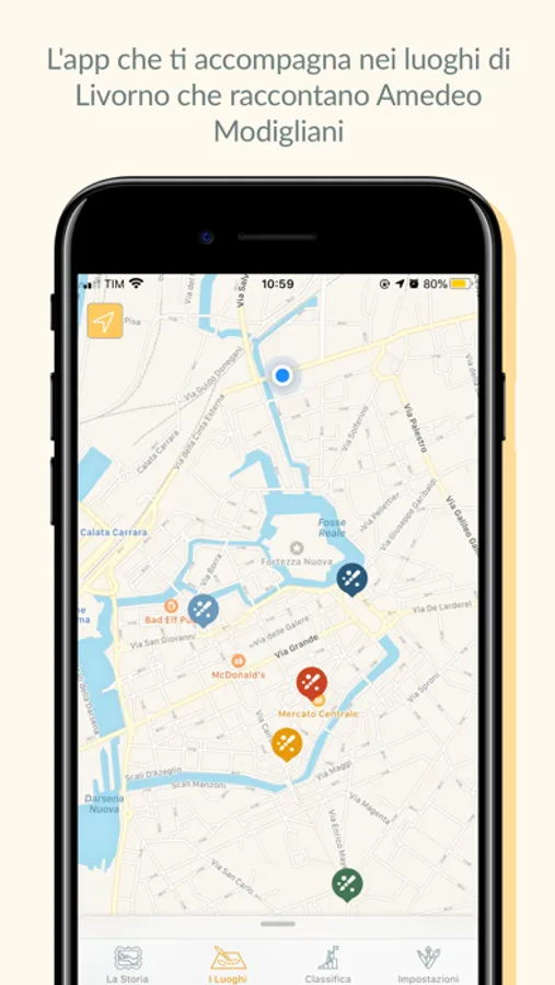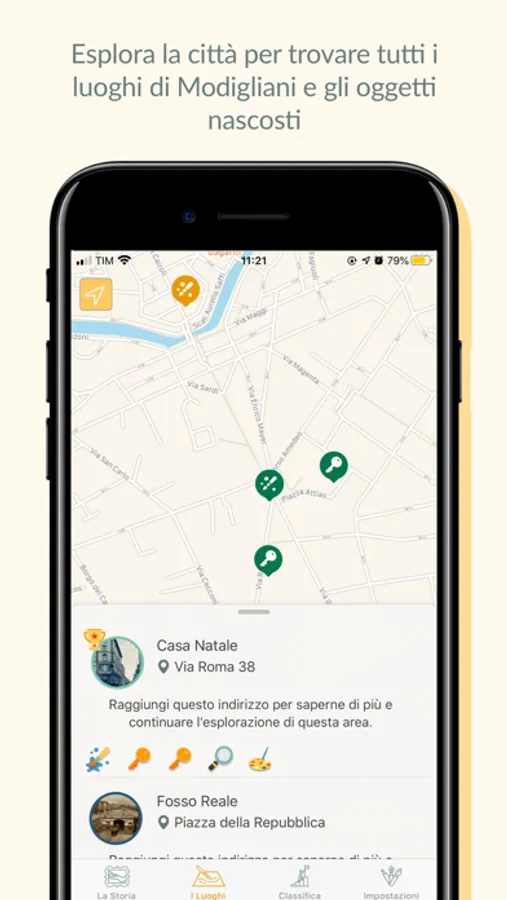 The Map helps you search for Modigliani's places in Livorno. The map shows you only a few places, around them are hidden other places and you have to go to search them, exploring the city. Each point of interest gives you access to a text that tells which episode or important character in Modigliani's story is connected to that specific place.