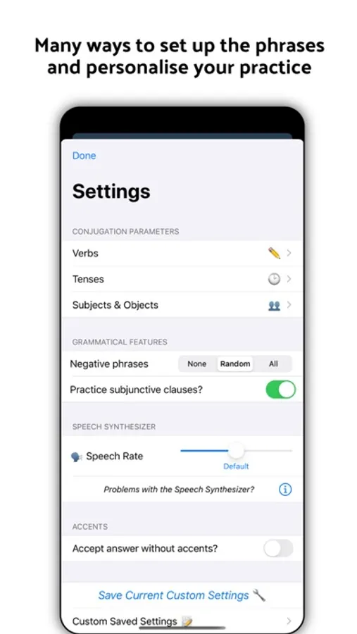 Unlike other conjugation apps, we allow you to choose what grammar you want to practice, and then our algorithm generates complete sentences to test yourself, so you can begin to internalise the feel of the language and start to construct your own phrases naturally and with confidence.