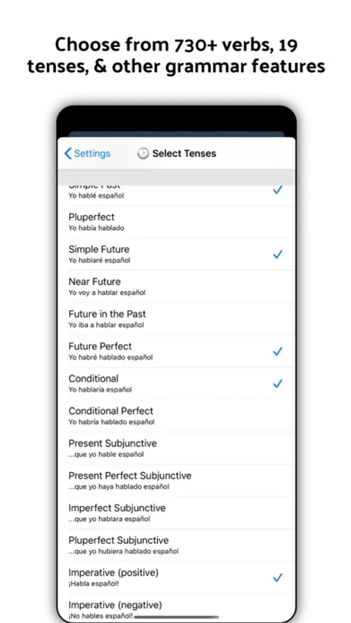 Select from 850 verbs, 19 tenses, and a range of grammatical features including personal pronouns, the subjunctive mood, conjugation types, interrogatives & negative phrases.