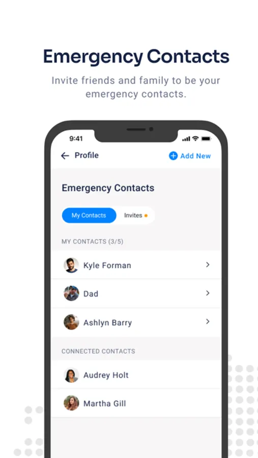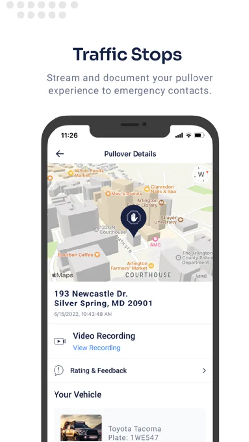 You can add friends & family as emergency contacts within the platform and share a trip with them. Your emergency contacts will be notified in real-time of your location so they can stay up to date with your location and make sure you reach your destination safely. You can always start a livestream at any given moment and your emergency contacts will be able to see first-hand if you're safe or not. You can use this in situations like a traffic stop or in areas where you feel unsafe.