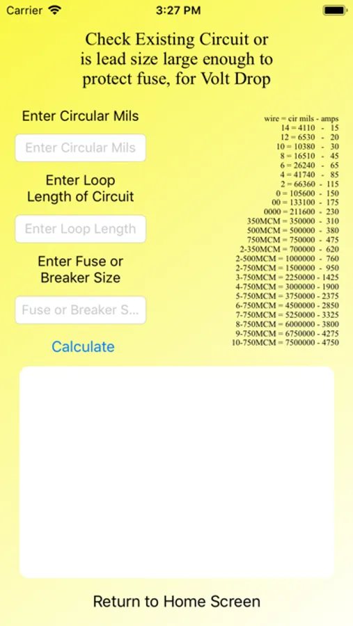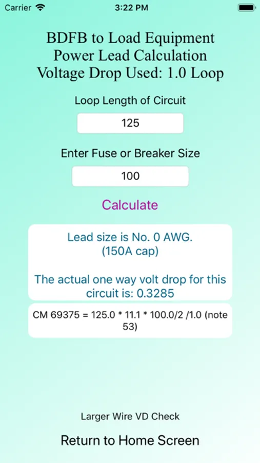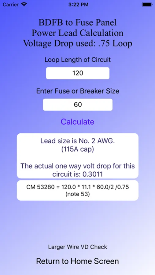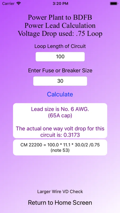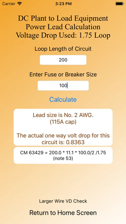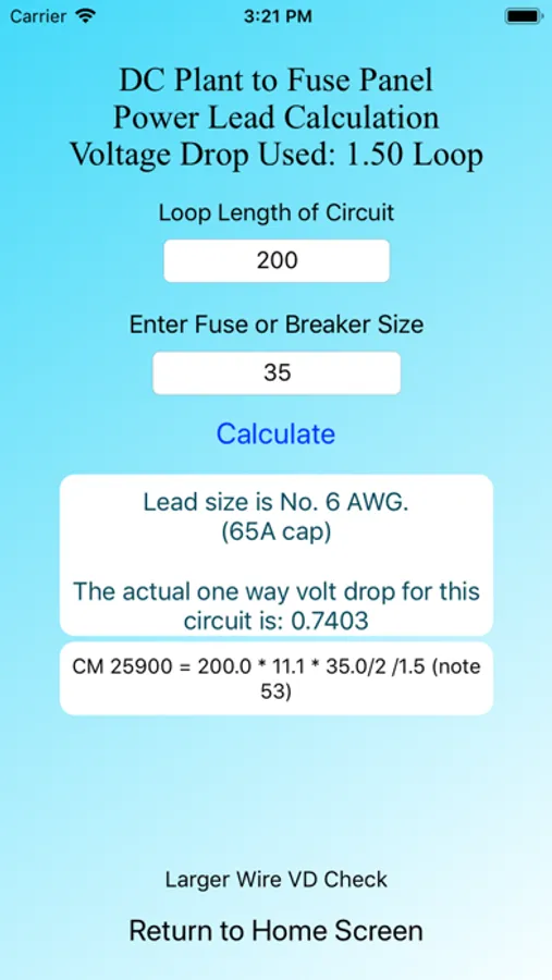 53. The formula used in the lead size calculations is: CM = LoopLength * 11.1 * Fuse or Breaker @ 100% / 2 (Circuits) / VD (for example T-Mobile might use 50% of the input breaker or fuse size to calculate DC power wires) CM = LoopLength * 11.1 * 2/3 Peak Amps or Busy Hour Amps / VD (for example the Bell System might use the leaDCalc recommended 66% of the input breaker or fuse size to calculate DC power wires) (The Bell System terms Peak and Busy Hour are antiquated electro-mechanical switch central office terms so leaDCalc recommends using 66% of the input fuse or breaker size, ie. 600A fuse or breaker calculate using 400 amperes and which is exactly what we did at Western Electric Co., Inc. for Bell System Telephone offices/). Where VD is the desired voltage drop for the circuit and 11.1 is the direct current contant resistance of telephone company approved copper wire (KS24194L-3 or equivalent) and the result CM is the circular mils used to determine the wire size required.