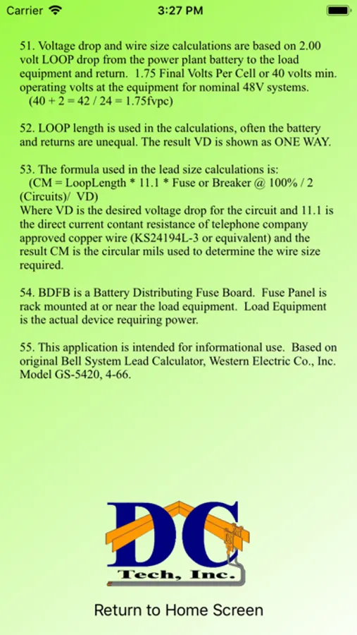 56. "leaDCalc" is NOT affiliated with any person or company or anything else anywhere. No how, no way. Especially NOT T-Mobile nor the Bell System or even Western Electric Co. Inc., all of whom are mentioned. This application is meant as a guide only in determining the size and or capacities of power wiring used in direct current (DC), charging and storage battery telephone systems. This application is NOT intended to decide what type of wire, (or if you should even use wire or busbars in your DC systems), no how, no way and it is not for use with alternating current (AC) systems.