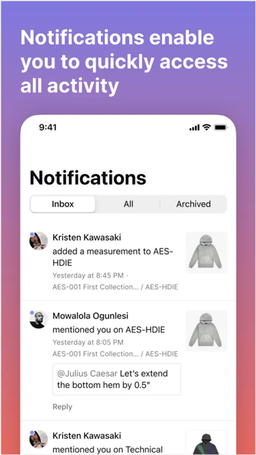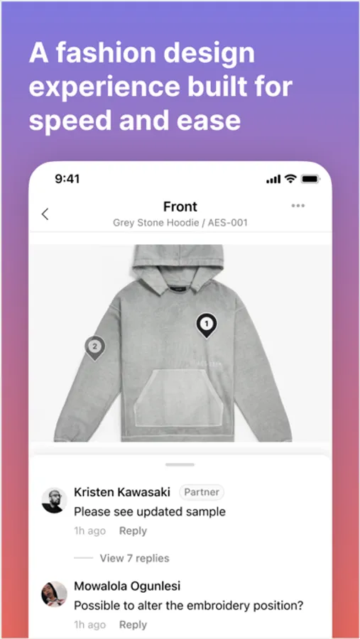 Our in-app design tool is a revolutionary re-imagining of the tech pack; enabling you to upload design inspiration, add contextual comments, and collaborate with your team in real-time.