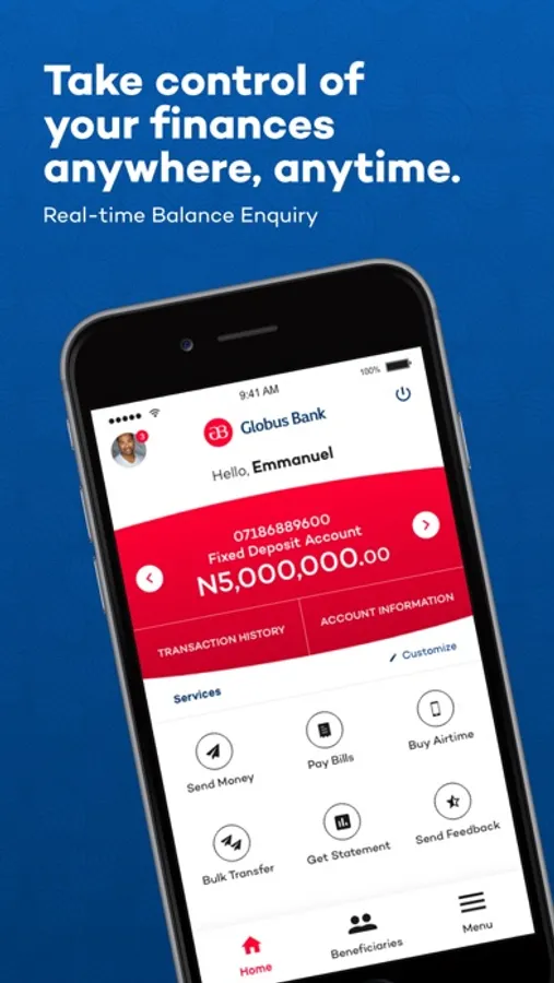 Globus Bank is revolutionizing the banking experience with its state-of-the-art application that allows users enjoy excellence in digital banking. With this application, you can open a Globus Bank account in just two minutes, generate a customized account number, and carry out different banking activities without any visit to the branch. GlobusMobile is a quick, safe and convenient banking application designed to fit your contemporary lifestyle.
