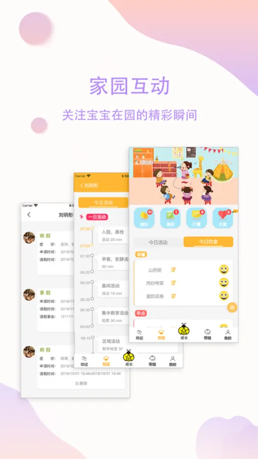 【校园】贴心的家园共育,全方位关爱宝宝为孩子绑定幼儿园的家长可以查看学校通知信息以及宝宝在校实时的状态,包括:一日活动情况、学习情况、饮食情况。可以进行叮嘱和请假,接收老师发来的关爱消息、个性化亲子作业。每天放学后,系统还可以根据宝宝在校情况分析,提供离园后的照料方案;