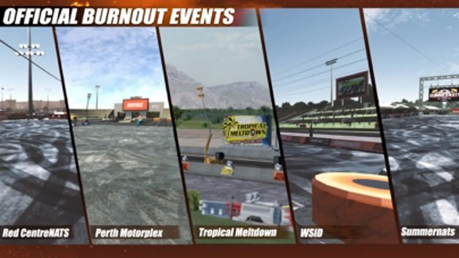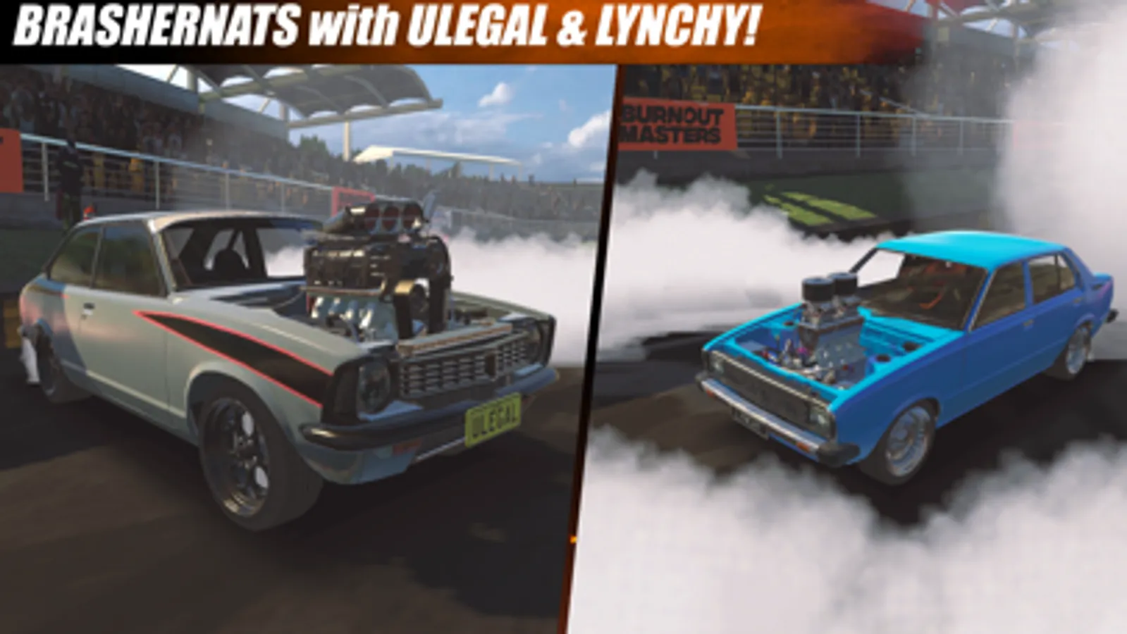 The official BURNOUT MASTERS game features more than 35 real life competitor cars and over 70 cars to build and customise. Burnout Masters is the official burnout game featuring the iconic Summernats event as well as the official events Red Centre NATS, BRASHERNATS at the Western Sydney Dragway, Tropical Meltdown at Springmount Raceway, RockyNATS, Motorvation at Perth Motorplex, GAZZANATS and Rapanats in New Zealand.