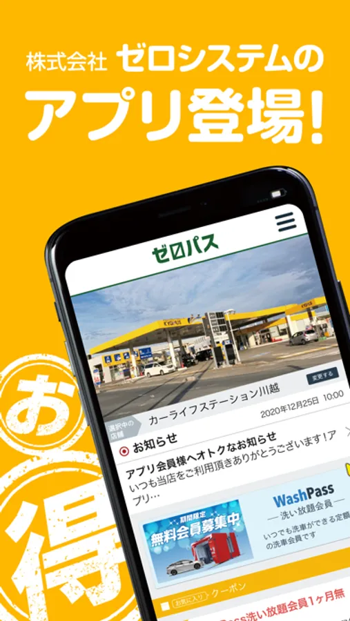 当社のアプリ「ゼロパス」ではWashPass(セルフ洗車機 洗い放題会員)、WashPassプリカ(セルフ洗車機 プリペイドサービス)のお申し込み・お支払い・ご利用いただけます。また、アプリで簡単に洗車・コーティングなどのご予約や愛車のメンテナンス管理が可能の他、ご登録いただいた店舗で利用いただけるお得なクーポンや各種メニューの割引情報を配信しております。