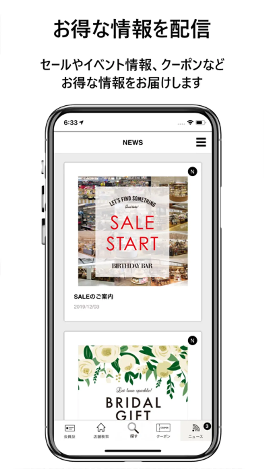 このアプリでは、ギフトのセレクトショップ「BIRTHDAY BAR」(バースデイバー)ならびに、キッチン雑貨店「CUISINE HABITS」(クイジーヌハビッツ)の店舗で会員証としてご利用いただけるアプリです。