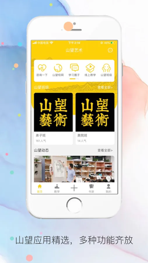山望画室APP,旨在增强学员与老师和家长之间的交流学习,以及为师生搭建网上互动桥梁。APP增加了学习圈、在线课程、提供线上教学以及离线教学模式,并提供多种班级选择。APP中拥有庞大的教学资源,类如课件、视频等教学资料,教师可以在线制作课件,录入音屏等操作,使教学更加方便。山望画室APP为家长提供了解我校的先进教学理念以及强大的师资力量的功能,以及为家长和学生提供在线咨询等功能,还可以通过APP能及时了解最新的报考信息,为学生解决升学问题。