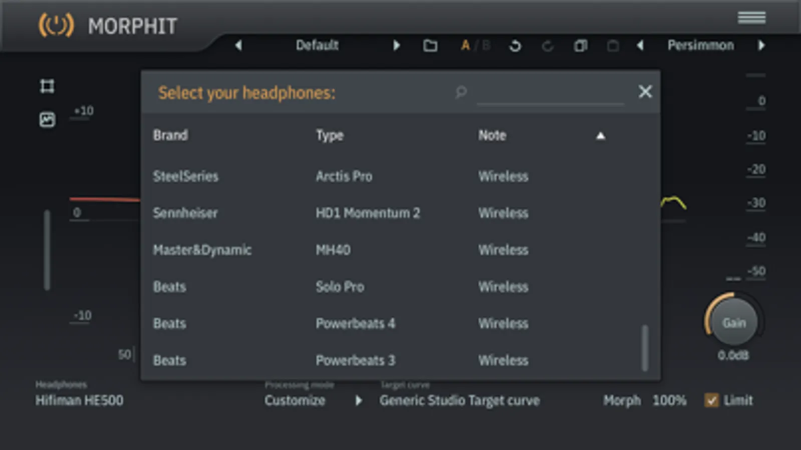 3. Select the headphones you are using from the list of supported headphones provided within the TB Morphit app. That's it - all audio going through the Audio Unit plugin is optimised for your headphones.