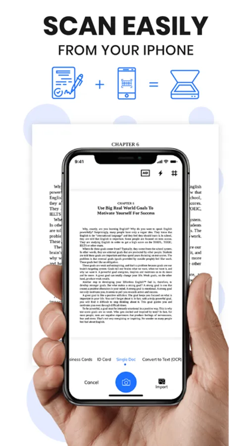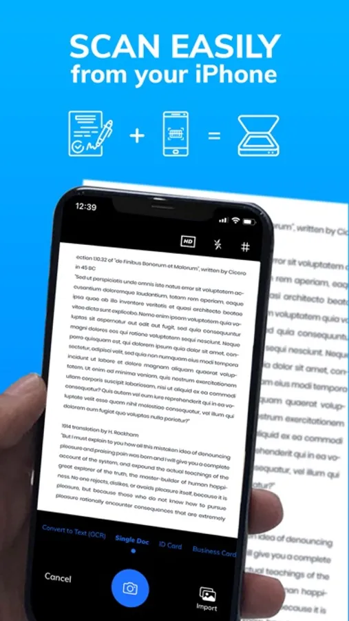 - Scan any documents like passport, ID card, bill, invoice, receipt, book, business card, word text documents, form, etc.