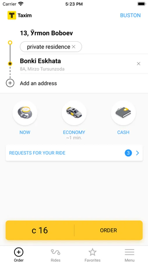 Start entering an address and the app will display autocomplete suggestions. An even faster alternative is to mark the required address on the map. Add, swap or delete an unlimited number of addresses before the ride or even en route. The app will remember the route, so you can just select it from the list next time you need a ride.