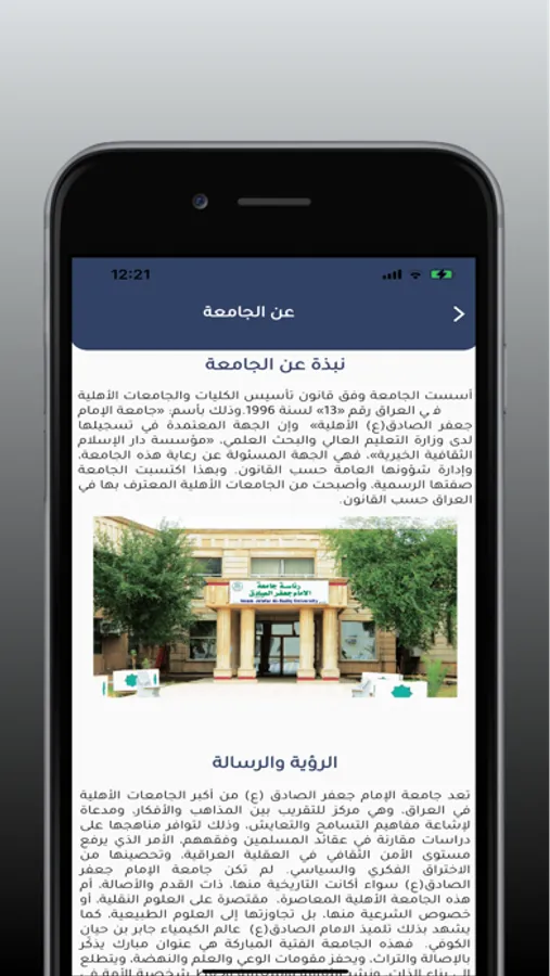 هذا التطبيق متاح للناس عامةً ولطلاب جامعة الامام جعفر الصادق (ع) خاصةً. يعرض التطبيق اخبار واعلانات الجامعة اليومية بالاضافة الى الكتب المتوفرة في المكتبة المركزية التابعة للجامعة مع مواقعها داخل المكتبة لتسهيل استعارة الكتب من قبل الطلاب. يحتوي التطبيق ايضا على تعريف عن فروع الجامعة (بغداد والمحافظات) بالاضافة الى الموقع الجغرافي لهذه الافرع. يسهل التطبيق امكانية الحصول على معلومات عن الكليات والاقسام الموجودة ضمن الجامعة فيما يخص اقساطها السنوية والمقررات الدراسية لكل مرحلة. كما يحتوي التطبيق على مساحة مخصصة لكل طالب من طلاب الجامعة لتمكينه من الاطلاع والتأكد من الاقساط التي تم دفعها من قبله بالاضافة الى تذكيره بالمبلغ المتبقي عليه.