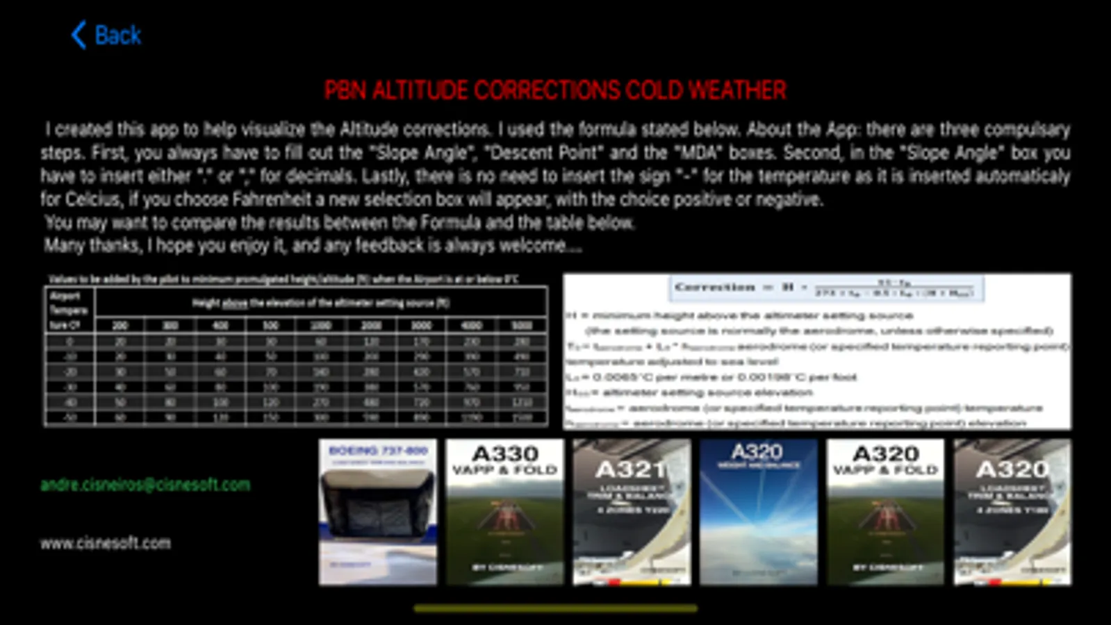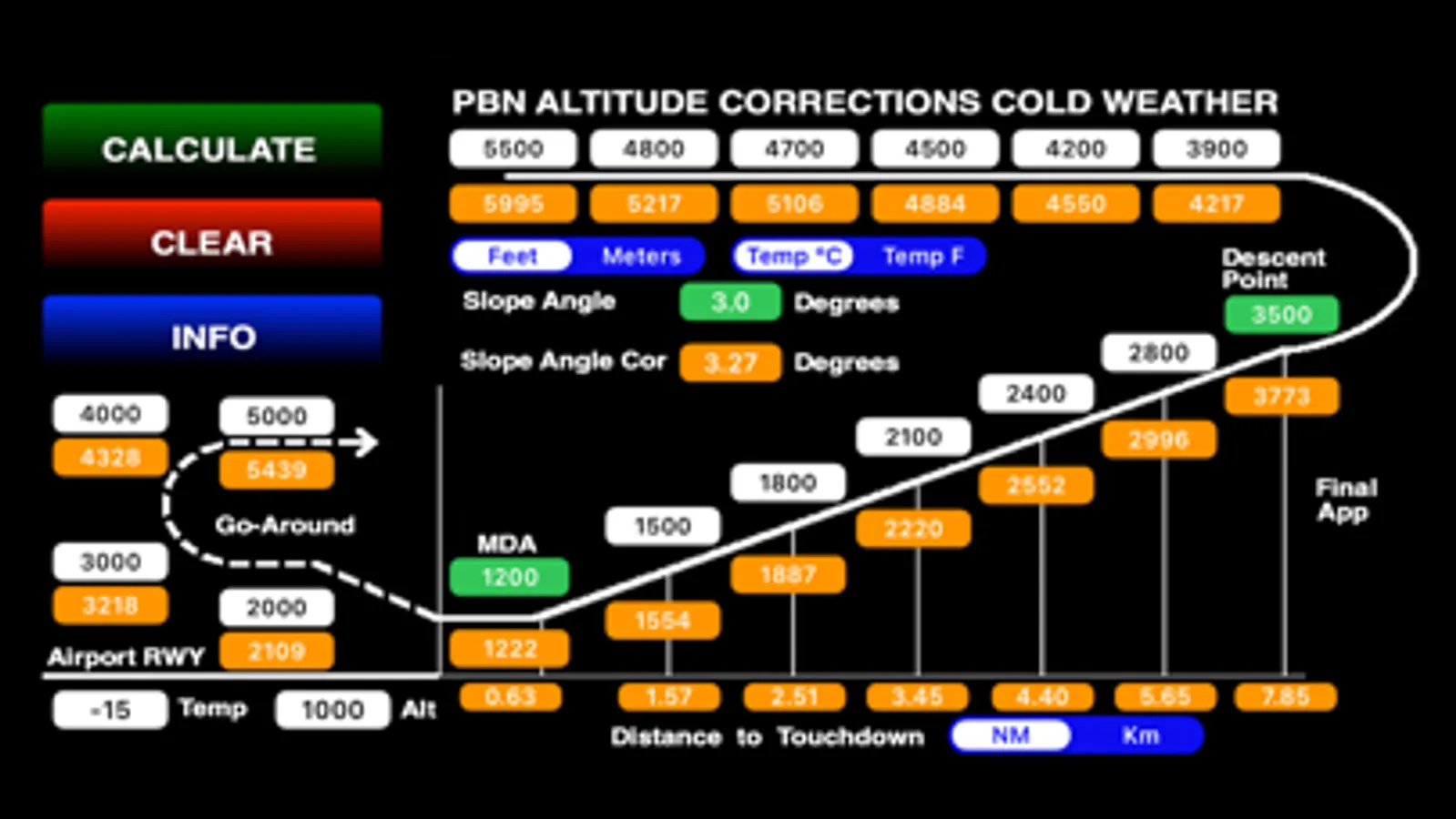 I created this app to help visualize the Altitude corrections due to cold weather. The calculations are made using the ICAO formula from doc 8168. I have made the Intermediate and Final Approach and the Go-Around. So you have a complete approach displayed if needed. Works in feet, meters and in Celsius or Fahrenheit. Many thanks, I hope you enjoy it, and any feedback is always welcome. Quick Reminder: USE ONLY FOR PRACTICE PURPOSES.