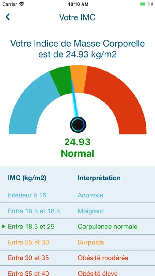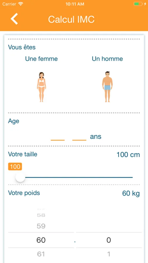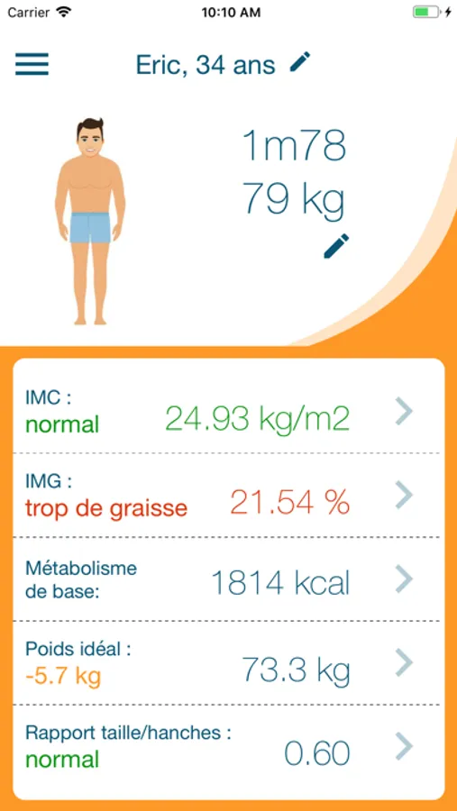 Notre application gratuite, permet en quelques clics de connaître votre poids idéal, votre IMC, votre IMG, vos mensurations idéales ainsi que votre métabolisme de base. Vous avez simplement à entrer quelques informations de base comme la taille et le poids et vous découvrirez tout de suite les résultats. Cette application est idéale pour suivre l’évolution de son poids en quelques clics seulement !