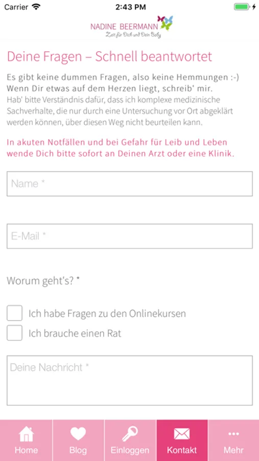 Die vermittelten Inhalte dieser App und der Kurse sind von Hebamme Nadine Beermann fachlich und sachlich geprüft. Sie können jedoch keine persönliche Untersuchung bzw. Beratung durch einen Arzt oder eine Hebamme vor Ort ersetzen. Liegen Risikofaktoren vor/während oder nach der Schwangerschaft, Herz- und/oder Kreislaufbeschwerden, Lungenerkrankungen, Gelenkbeschwerden oder anderen gesundheitliche Beschwerden und Erkrankungen vor, wird dringend empfohlen vor der Nutzung der Inhalte einen entsprechenden Facharzt zu konsultieren.