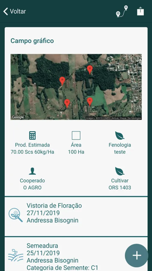 - Aplicação de produtos, vistorias detalhadas, acompanhamentos, seguidos por registros de informações através de índices, fotos e comentários de voz.