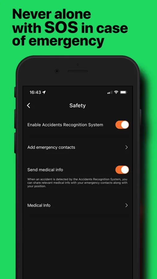 - Rider assistance (accidents recognition, emergency contacts, medical info sharing, etc.)