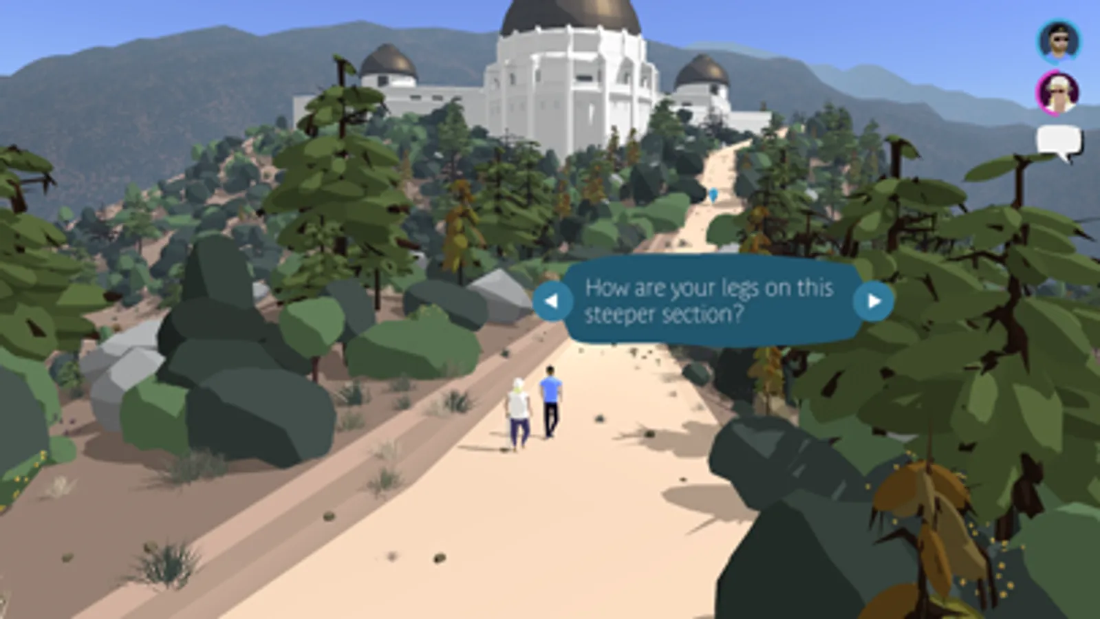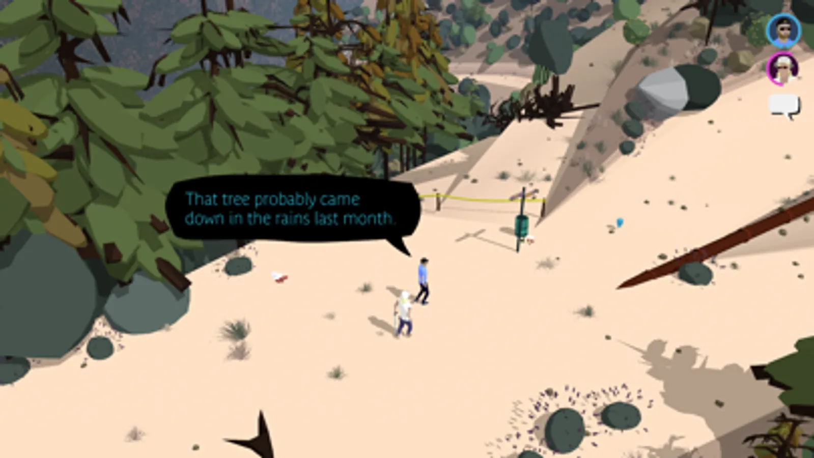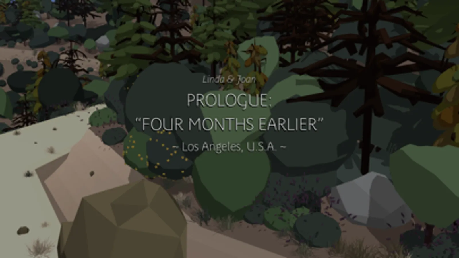 Prologue: “Four Months Earlier” is part one of the story. Linda is visiting Russell in Los Angeles, where he now lives. We join them halfway up a hiking trail. You must walk them to the top. Linda is using a stick and is unable to move as quickly as Russell. Keep them within earshot and they’ll chat about Linda’s visit and the past, while trying to find the right time to bring up what’s weighing on their minds.