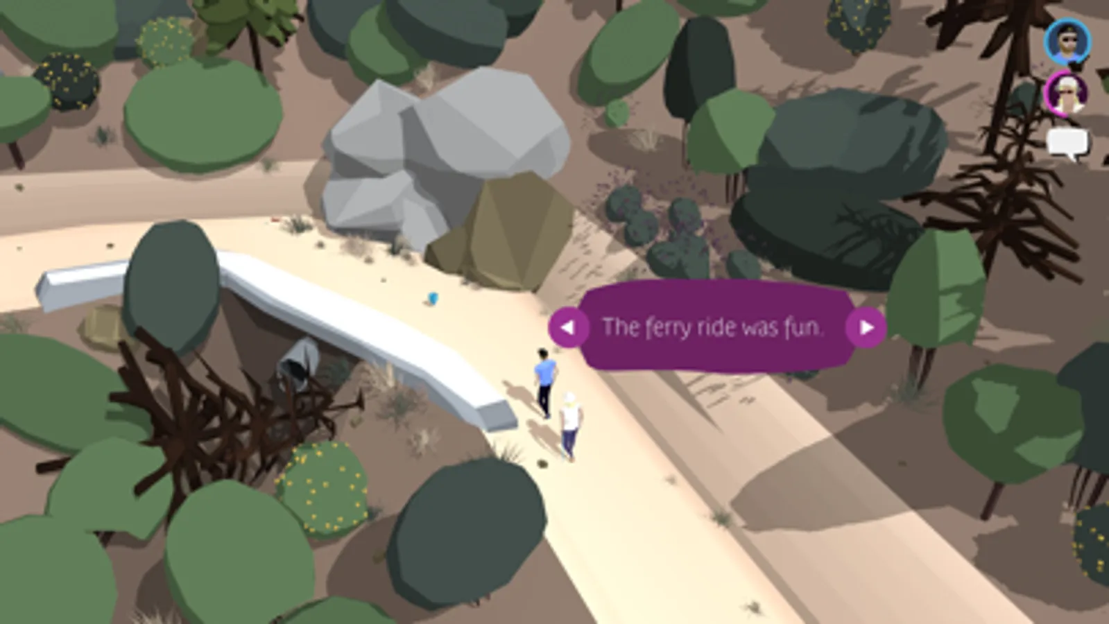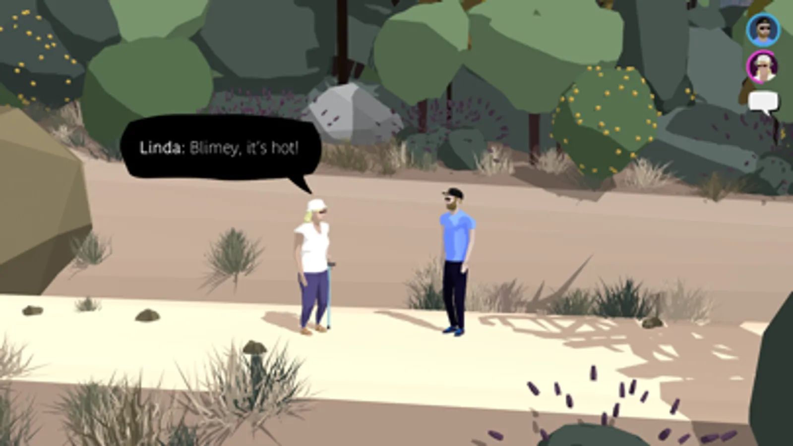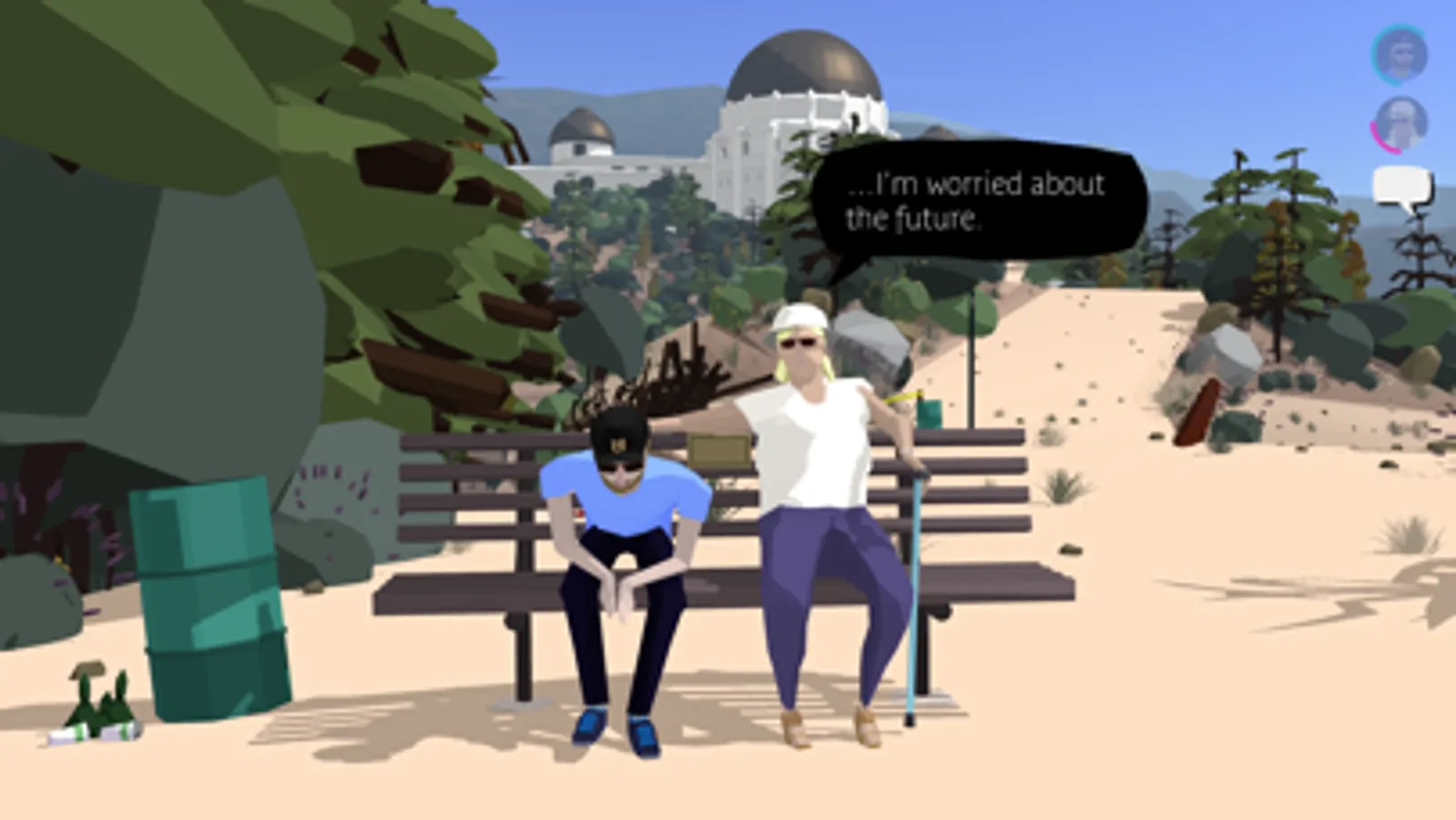 Prologue: “Four Months Earlier” is part one of the story. Linda is visiting Russell in Los Angeles, where he now lives. We join them halfway up a hiking trail. You must walk them to the top. Linda is using a stick and is unable to move as quickly as Russell. Keep them within earshot and they’ll chat about Linda’s visit and the past, while trying to find the right time to bring up what’s weighing on their minds.