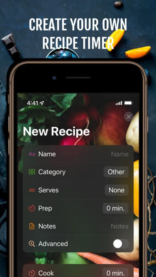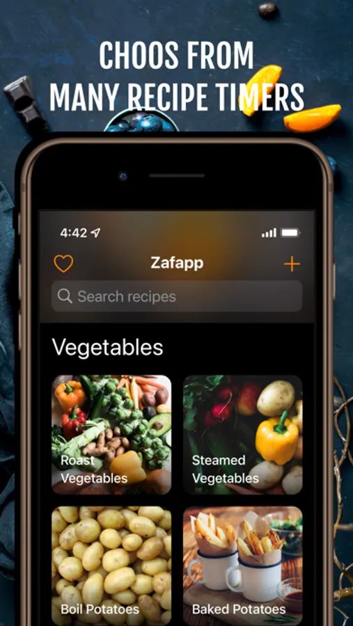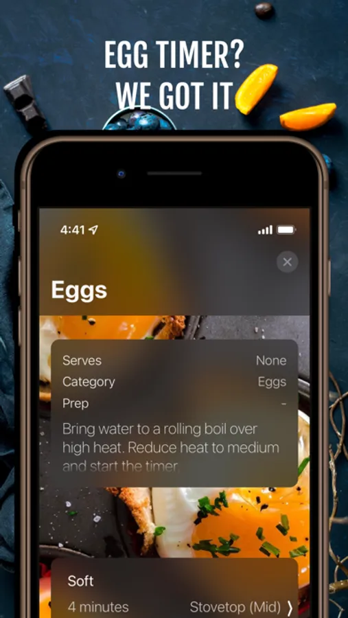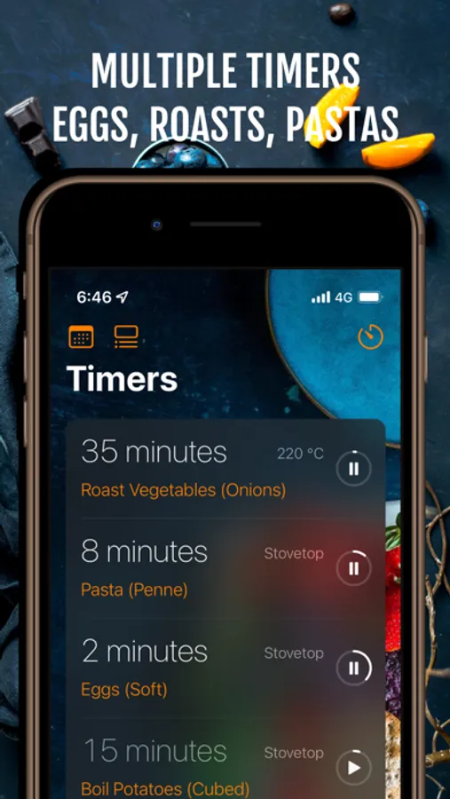 • Browse through timers for different meals from eggs, pasta, vegetables to fish, steaks, pizza and dessert.