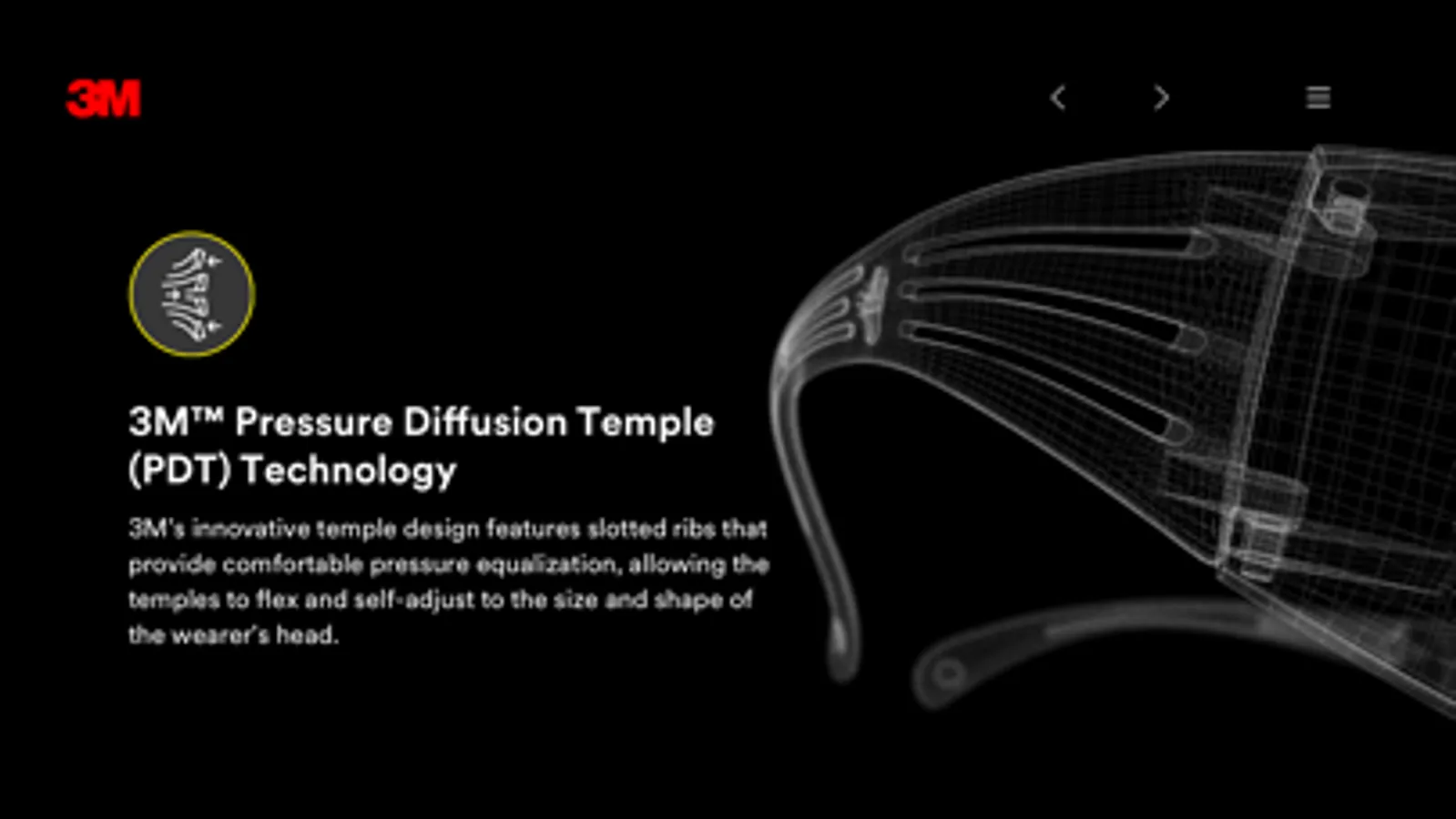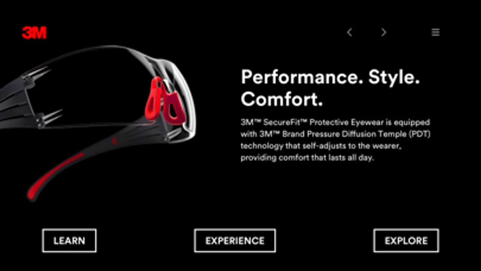 The 3M™ SecureFit™ Eye Protection app is designed to help individuals understand the science behind proprietary SecureFit™ Pressure Diffusion Temple (PDT) Technology. Users will learn what SecureFit is and how the technology was developed as well as interactively experience its’ effectiveness through the PDT demo tool. Other features include an overview of each SecureFit product series to help those in need of safety glasses select the model that best suits their application.
