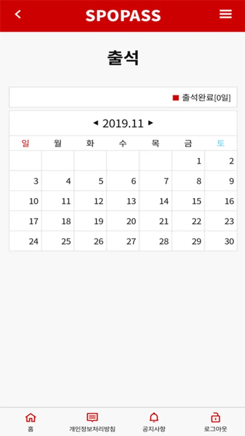 > 이용중인 가맹스포츠센터에 입장한 정보를 기간별로 확인이 가능합니다.