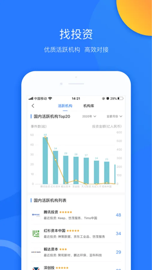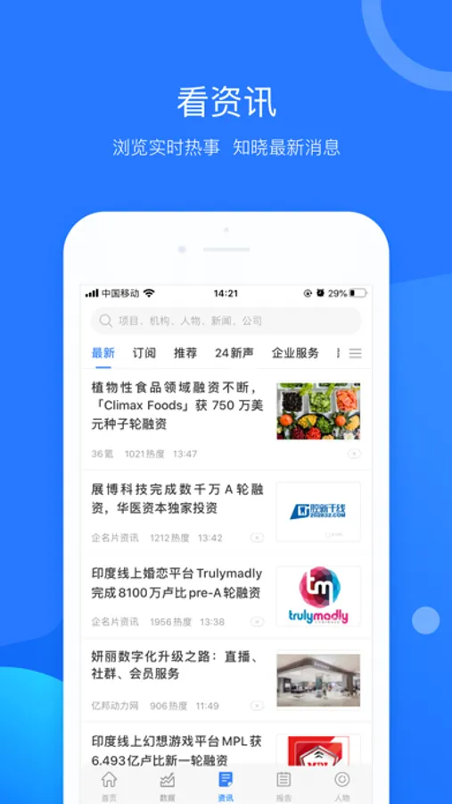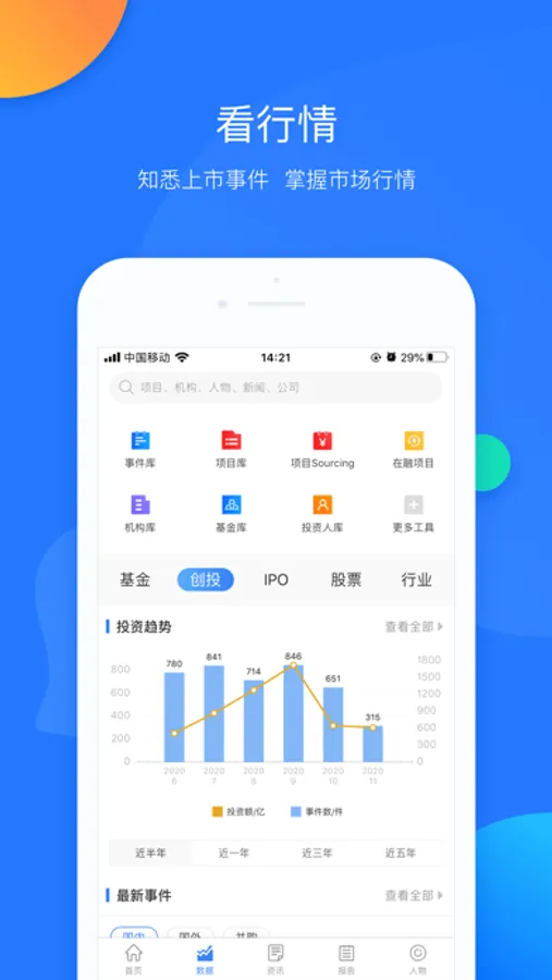 作为企业版PC端的延伸,移动端继承了成熟的数据结构体系,为专业人士提供了与之匹配的更业数据库,纬度跨越国内-国外,一级-二级,投资-募资,项目-机构等;内容包括融资事件,股票行情,财务数据,研究报告,最热赛道,项目榜单等;专注于发现优质项目,追踪实时动态,分析创投趋势;做最专业的数据,见最美丽的彩虹